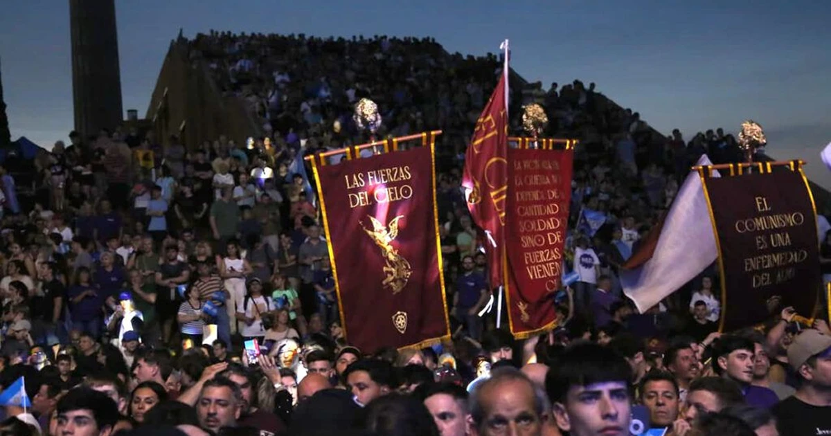Las escalinatas del parque España se fueron colmando desde la tarde y cerca de las 20 el vocero presidencial Manuel Adorni dio las primeras palabras de apertura del acto a la manera de maestro de ceremonia luego de los fuegos artificiales que dieron la bienvenida a los militantes.