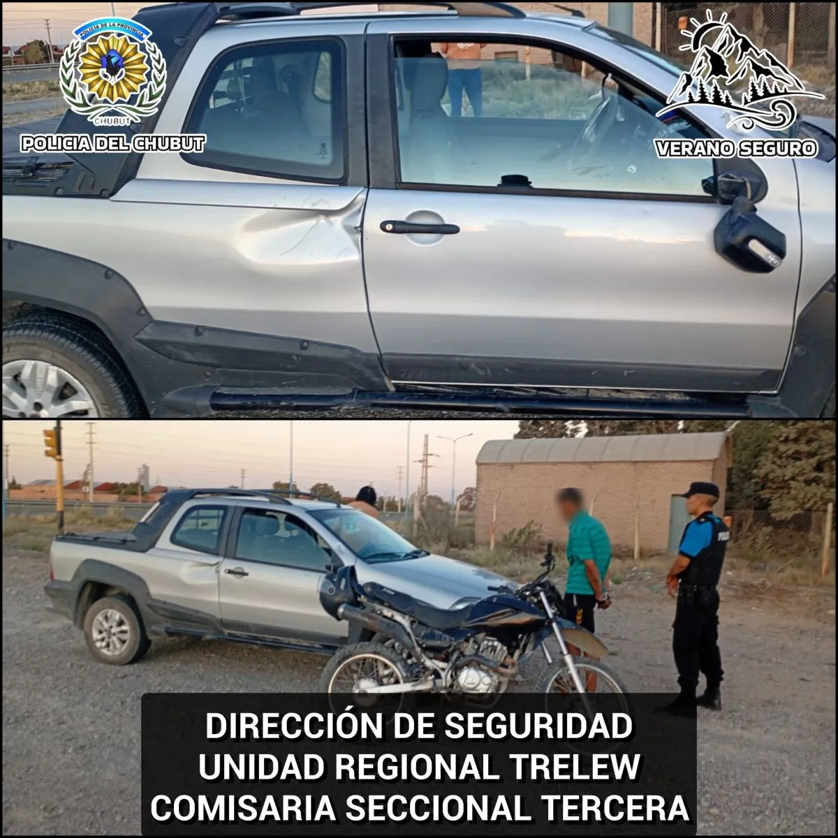 El hecho ocurrió el viernes por la noche en la ciudad de Trelew, cuando una camioneta Fiat Strada que circulaba por calle 26 de Noviembre fue impactada por un motovehículo que transitaba por la avenida De la Plata. Tras la colisión, el conductor de la moto intentó darse a la fuga del lugar del accidente.