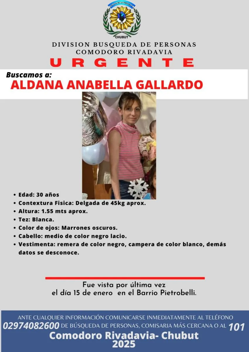 Una mujer llamada Aldana Gallardo, de 30 años, desapareció en la localidad de Comodoro Rivadavia. La última vez que la vieron fue en el barrio Pietrobelli, el jueves 15. En ese momento, vestía una remera negra y una campera blanca; el resto de su vestimenta se desconoce.