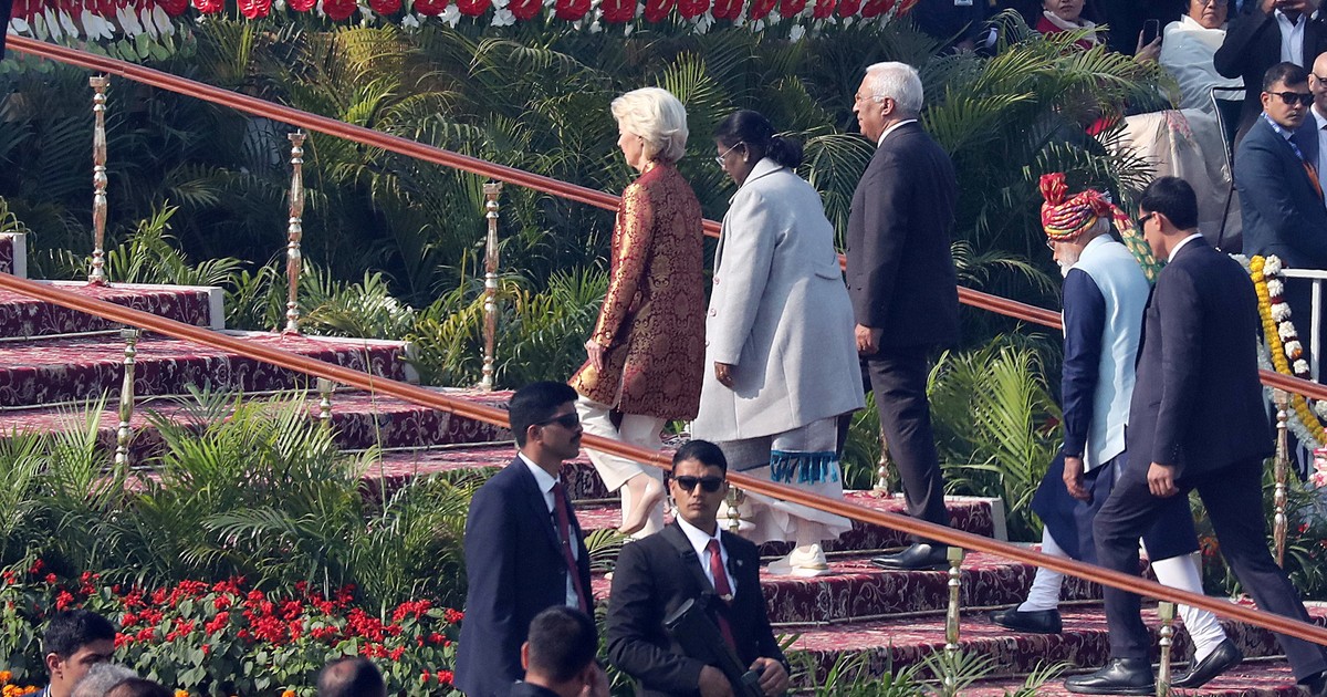Von der Leyen, el presidente del Consejo Europeo António Costa y la canciller europea Kaja Kallas, participaron este lunes en una gran ceremonia de bienvenida en Delhi, con desfiles militares y bailes tradicionales.