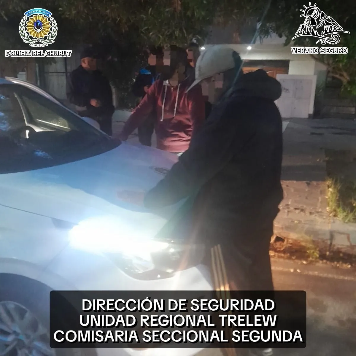 Un móvil de la Comisaría Seccional Segunda de Trelew acudió a la zona y realizó un recorrido por las inmediaciones de la plaza. Los agentes lograron dar con los presuntos autores en avenida Rawson, entre A. P. Bell y Ameghino. En el momento de la aprehensión, uno de los individuos tenía en su poder el teléfono celular que había sido denunciado como sustraído.