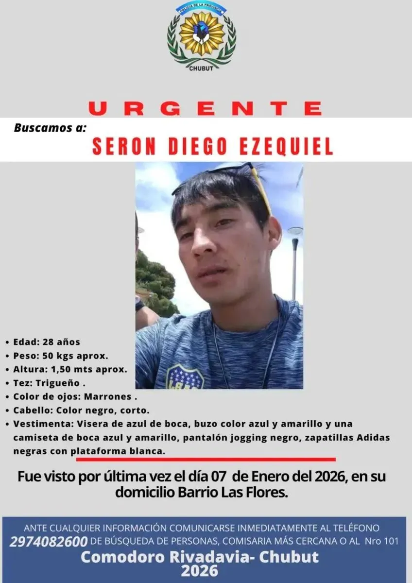 Diego Serón desapareció el 7 de enero, y su familia lleva 8 días sin saber nada de su paradero. Su padre, Juan Serón, encabezó la marcha por pedido de justicia y seguridad por el homicidio de Valeria Schwab (39) y allí también denunció las dilaciones en la investigación del caso.