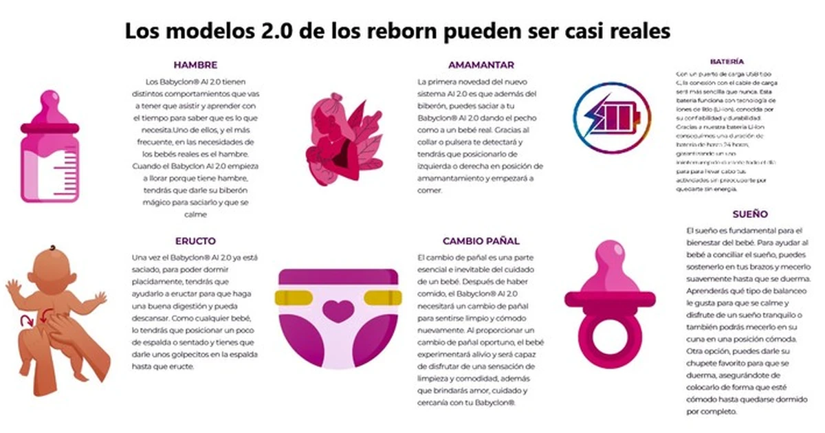 Algunos modelos ya emiten sonidos, preludio de una evolución tecnológica más ambiciosa: pronto habrá versiones que articulen palabras y simulen crecimiento. En sus primeros meses producirán balbuceos y al llegar al año comenzarán a pronunciar palabras como “mamá” o “papá”, consolidando una generación de réplicas más humanas.