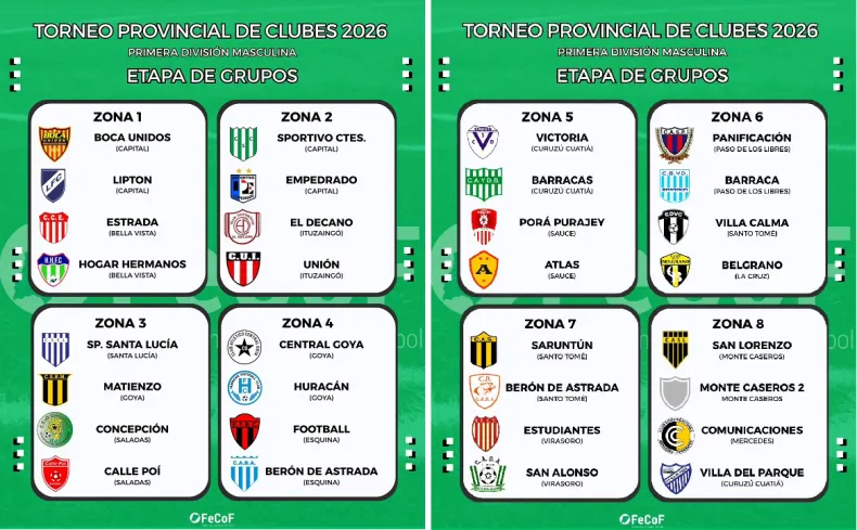 La Federación Correntina de Fútbol confirmó el sábado último la conformación de los grupos para el torneo Provincial de Clubes de 2026, uno de los certámenes más importantes del calendario futbolístico local. La próxima edición contará con la participación de 32 equipos provenientes de distintas ligas de la provincia.