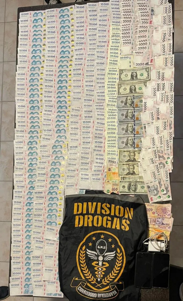 La causa incluyó además tres allanamientos: uno en el barrio Fontana de Puerto Madryn y dos en domicilios ubicados en Ingeniero Budge y Monte Grande, provincia de Buenos Aires. En estos procedimientos se incautaron más de tres millones de pesos en efectivo, teléfonos celulares, documentación relevante y el vehículo utilizado para el traslado de la droga.