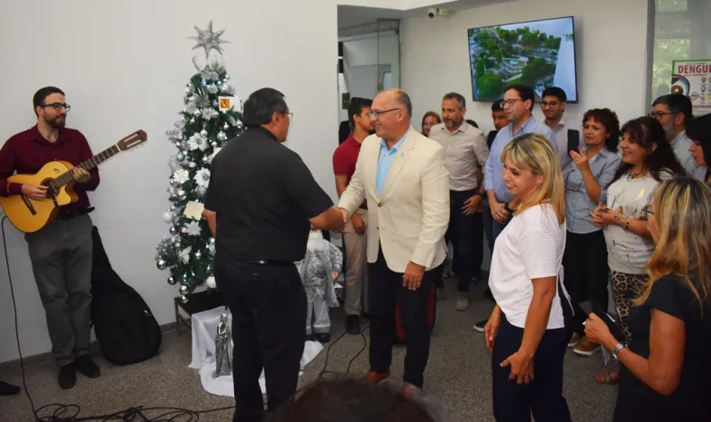 Con los acordes de tradicionales villancicos navideños, interpretados por el conjunto del Seminario Arquidiocesano Redemptoris Mater de Corrientes, que dirige el padre Eli Alfano, se vivió esta mañana un emotivo momento en el Ministerio de Obras y Servicios Públicos (MOSP), en el marco de la bendición del Pesebre de Navidad y ante la proximidad del nacimiento del Niño Jesús.