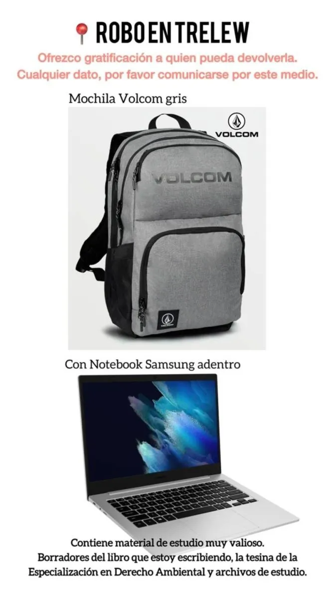 “Más allá del valor material, lo más importante es lo que tenía guardado en la notebook: borradores del libro que estoy escribiendo, (…) material de estudio muy valioso y archivos de trabajo. Ofrezco gratificación a quien pueda devolverla”, aclaró.