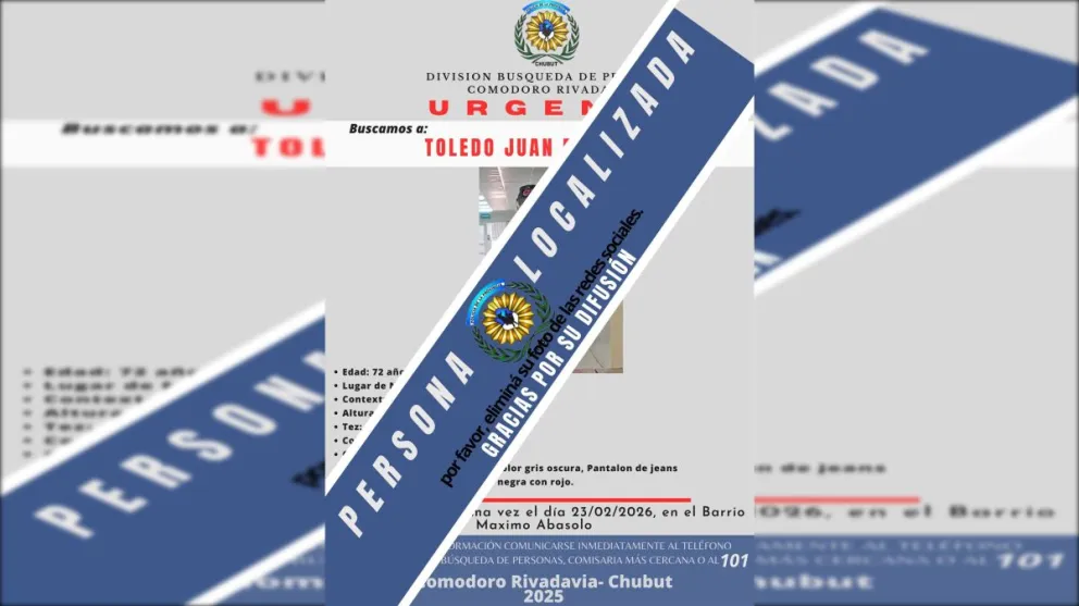 La División Búsqueda de Personas de Comodoro Rivadavia comunicó que se ha dejado sin efecto la investigación sobre el paradero de Juan Plácido Toledo, de 72 años de edad, luego de que el hombre fuera encontrado en buenas condiciones de salud. Por medio de un reporte oficial, la autoridad interviniente detalló que el ciudadano ya fue ubicado y no presenta ninguna clase de complicación, motivo por el cual se dio por concluida la labor de búsqueda.