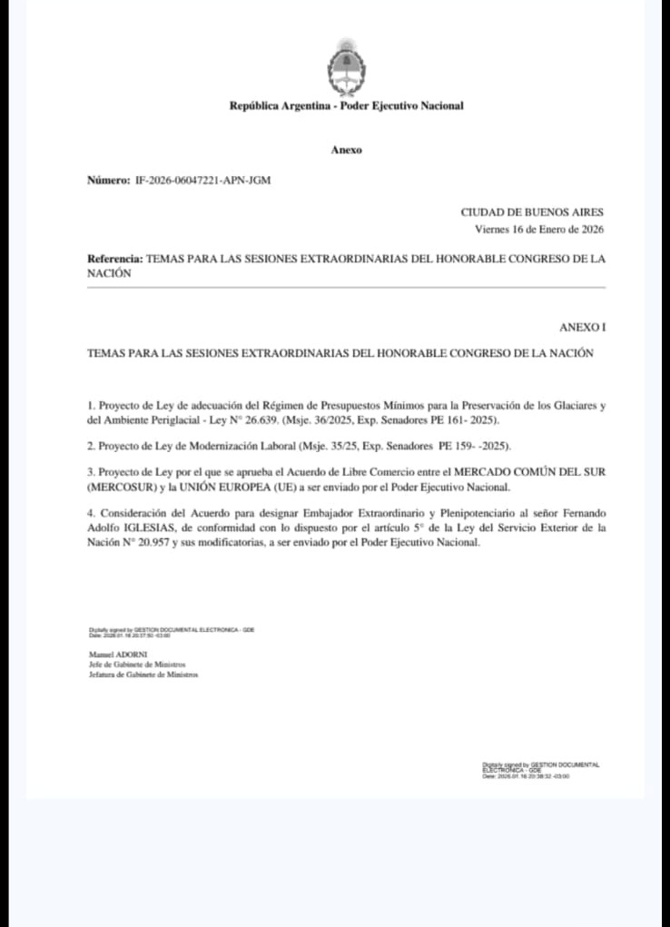 En un movimiento que anticipa una pulseada legislativa clave, el Poder Ejecutivo oficializó el llamado a sesiones extraordinarias durante febrero. La agenda, fijada por decreto 24/26 que dejó firmado el presidente Javier Milei antes de partir hacia la cumbre de Davos, concentra su foco en una transformación profunda de las reglas del mercado laboral.