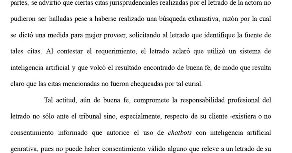 Según pudo saber Clarín, el juez, Oscar Pucinelli, buscó -sin éxito- durante varias horas el origen de las citas del abogado. Esto llevó al magistrado a solicitarle al profesional que identificara las fuentes, pero el problema era que no existían: el abogado reconoció que había usado IA para generar las citas, las copió y pegó “de buena fe”, esto es, sin saber que eran inventadas (pero sin verificarlas).