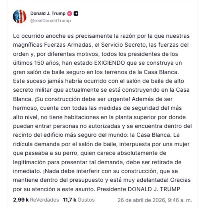 Al respecto, el mandatario destacó que una situación como la del sábado por la noche en la cena anual de corresponsales de la Casa Blanca «jamás habría ocurrido con el salón de baile de alto secreto militar que actualmente se está construyendo en la Casa Blanca». «¡Su construcción debe ser urgente!», reclamó.